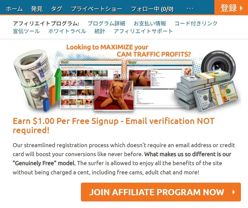 Chaturbate公式ページ より、通常の無料アカウントを作成することで、だれでもChaturbateアフィリエイトとして活動をスタートし、お金を稼ぐことができるようになります。