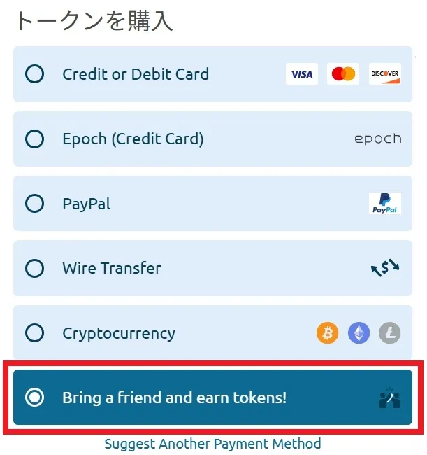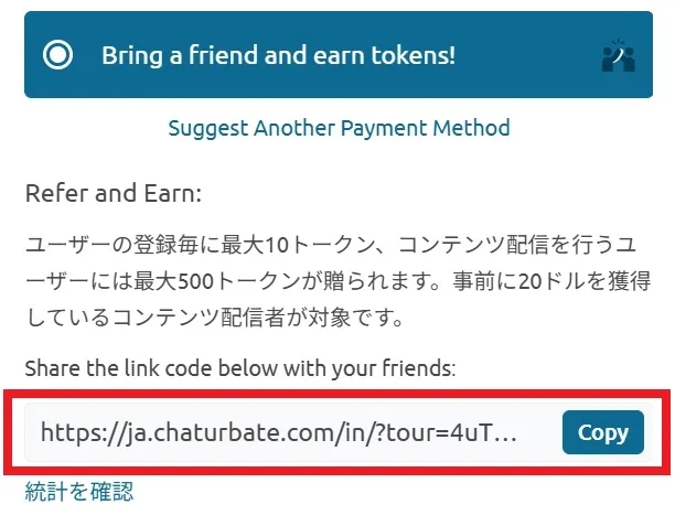Chaturbate公式ページ 内のトークン購入ページから、「More Payment Option.」のなかに、お友達紹介リンクを取得できる「Bring a friend and earn tokens!(お友達紹介でトークンを獲得する!)」の項目があります。